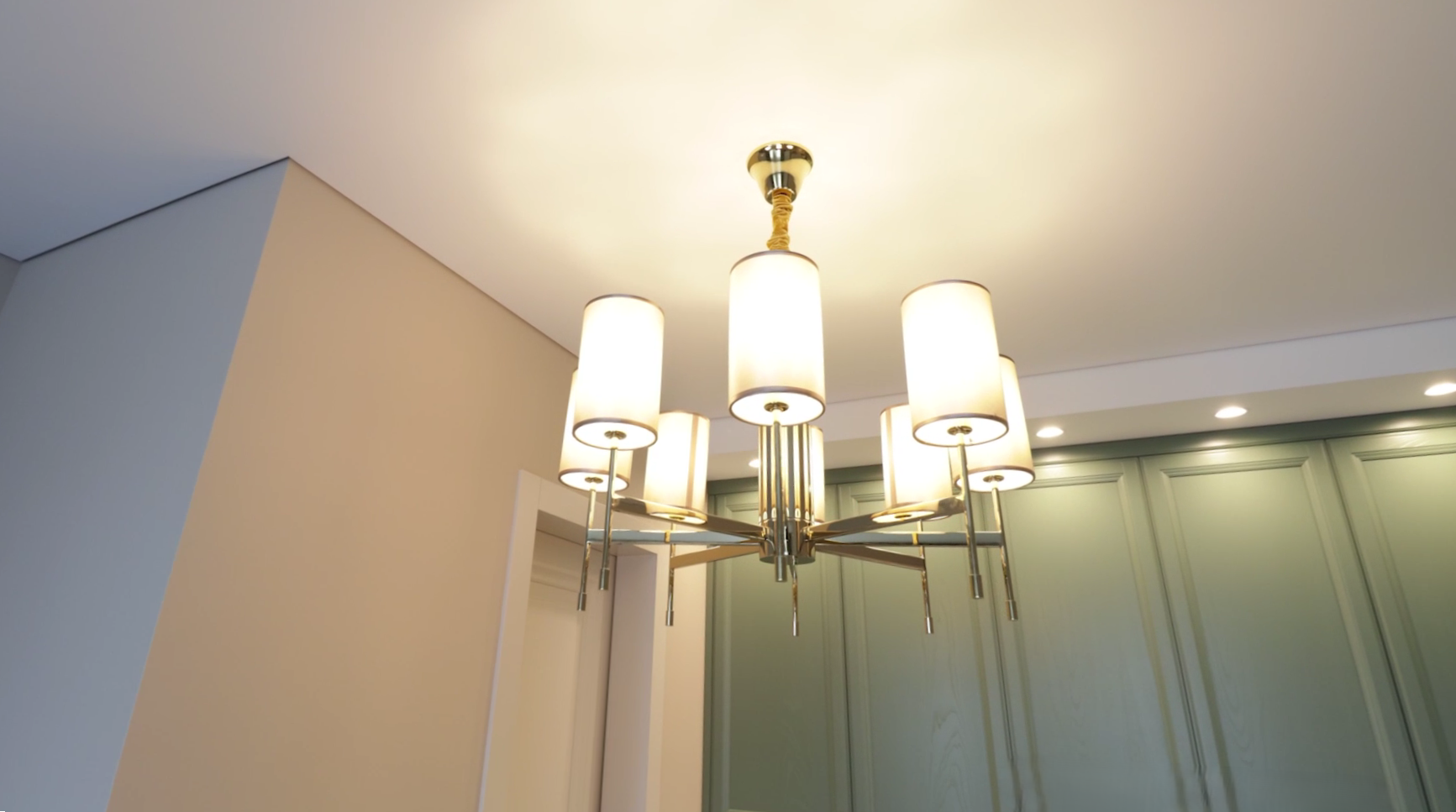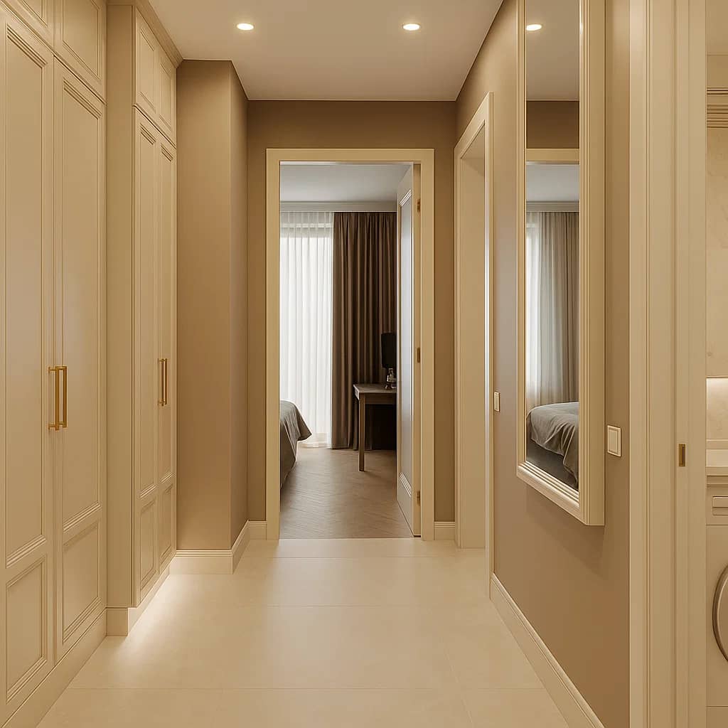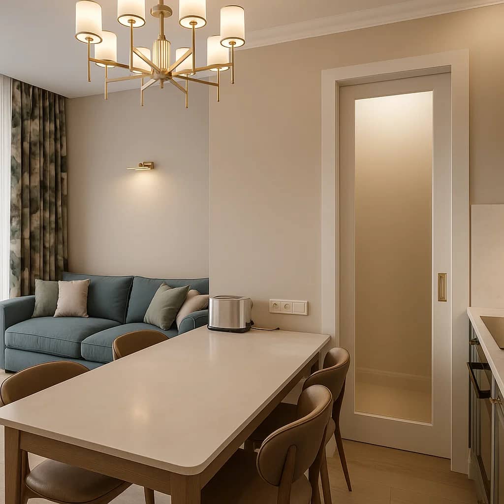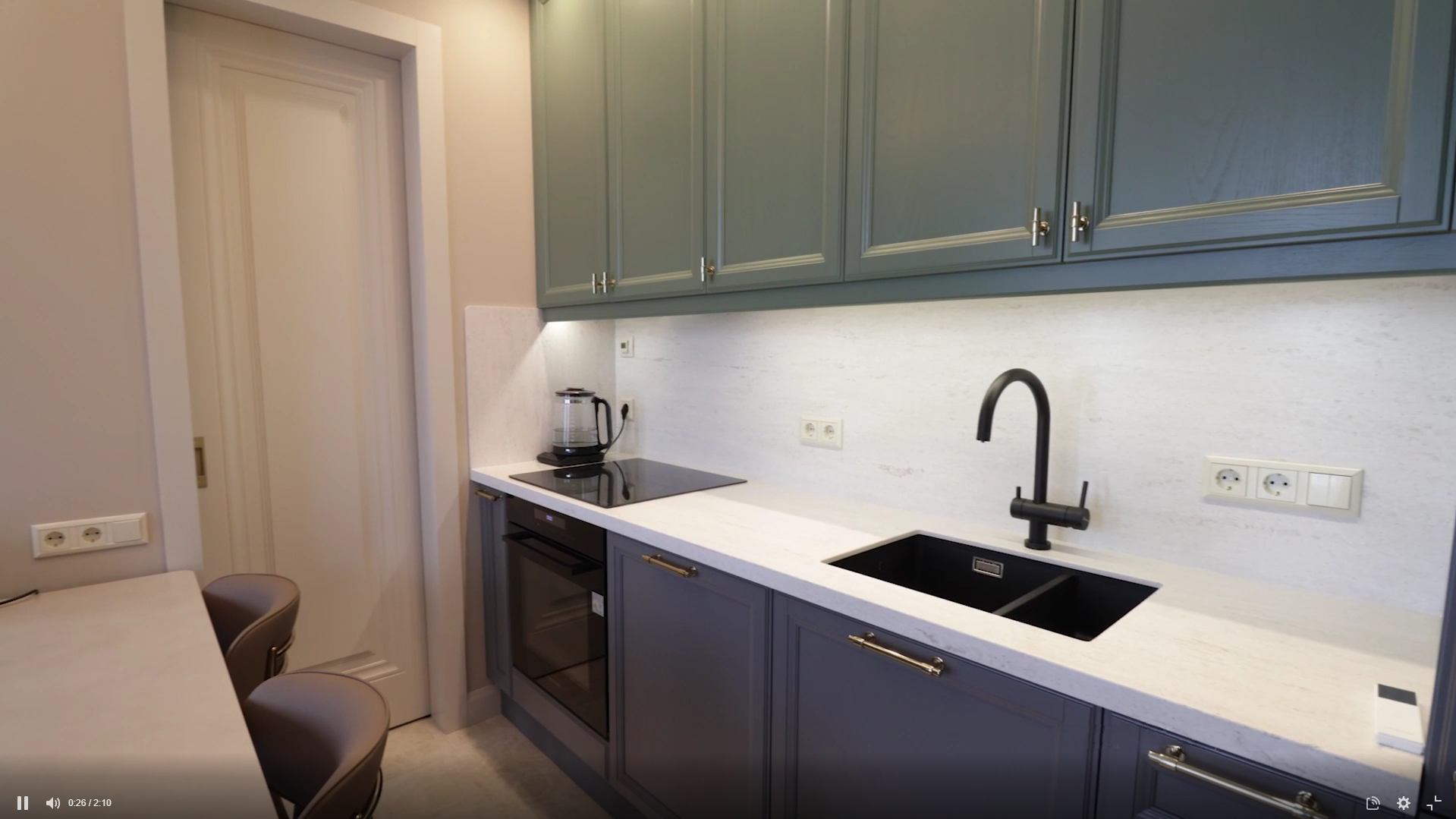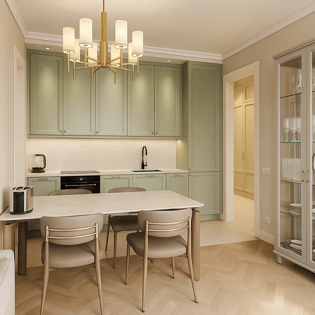 Квартира в теплых тонах с акцентными деталями. Сочетание бежевого, золотого и темно-зеленого, которое западает в душу.